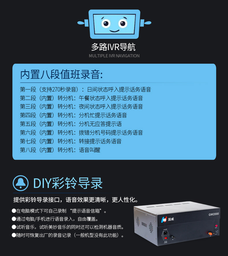 本系统多至4路的电脑话务员,固定区分8段语音,自录区录音段数分至7段,录音可以根据需求设置。提供灵活完善的话务员功能,使用户来电时在不同的状态听到不同的语音回答。