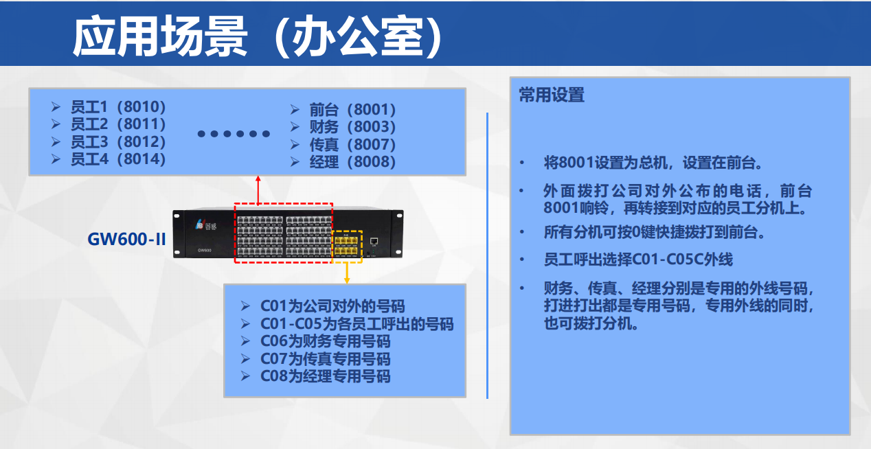 4:支持分机板提供8个RJ11电话线分机端口、为8部分机提供分机端口,具备分机状态跟踪并自检,终端话机可自由修改本机分机号。