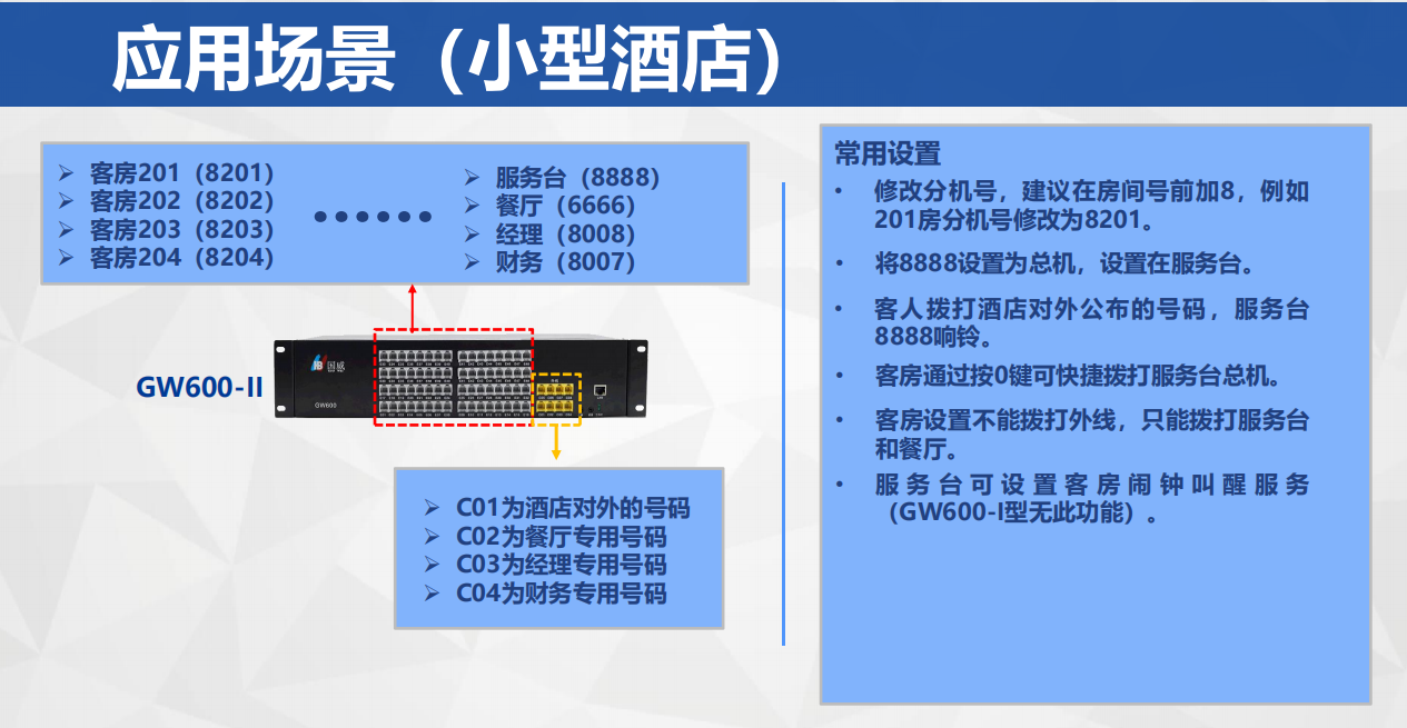 本系统带酒店管理功能,如叫醒、押金等功能,也带有转发功能,通过网络通讯方式,将数据转发到专业的酒店管理软件。