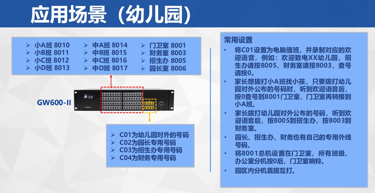 采用全新的来电显示控制技术,可实现内部拨打来电显示,外部来电可准确接收,兼容FSK/DTMF双制式,可任意传送到各振铃分机,包括转移,来电号码同时发送到PC控制软件进行显示保存。