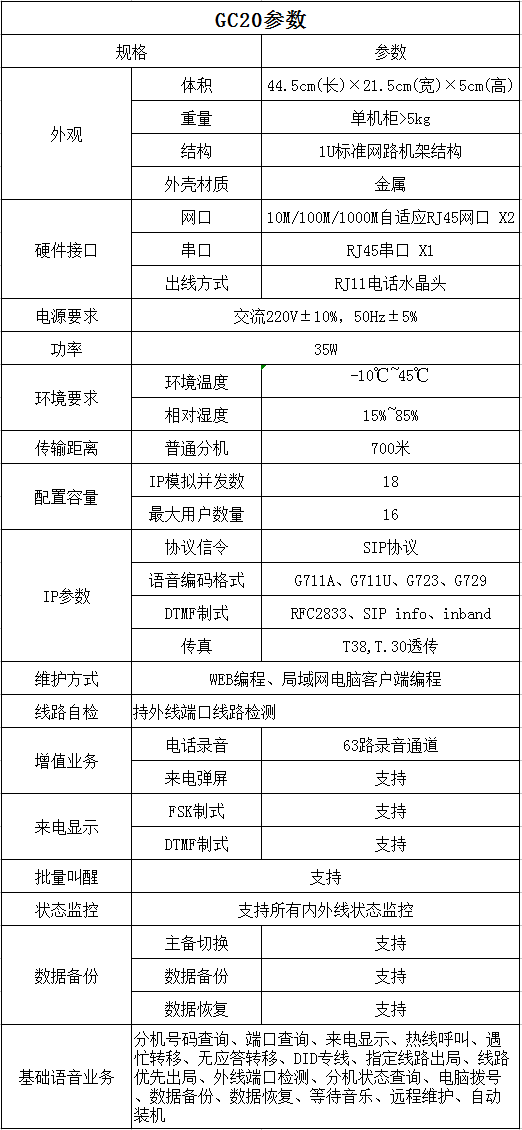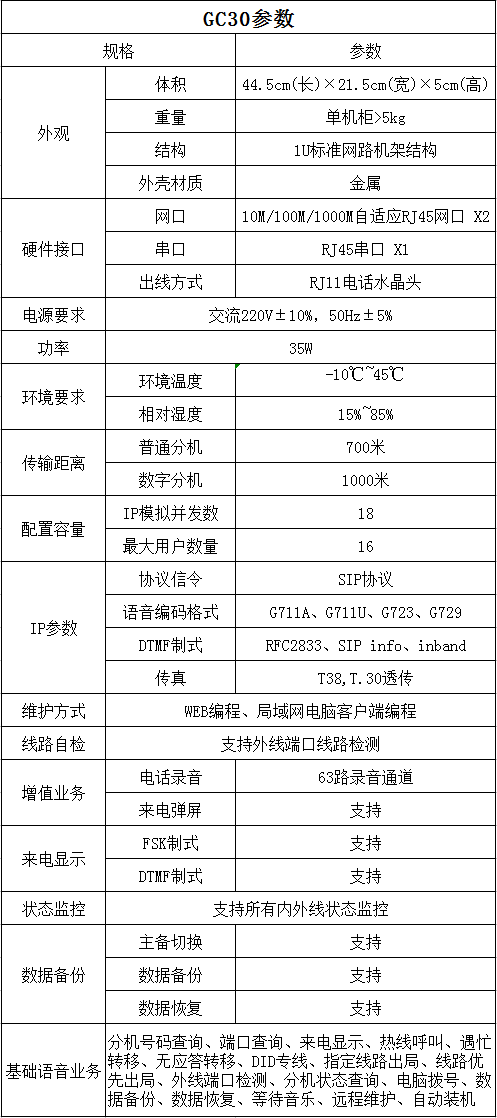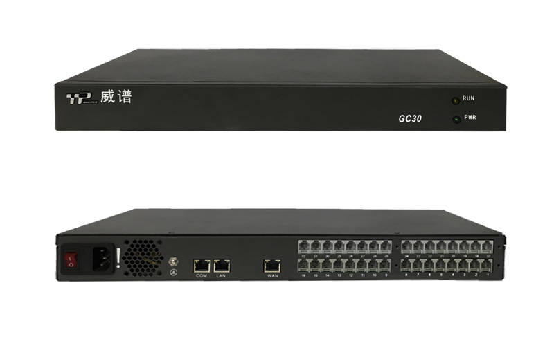 GC20 GC30| 多功能智能网关 :GC 系列语音网关是为运营商政企行业设计的智能型 、 高性价比机架式语音接入网关 。 使用 GC20、GC30 语音网关 , 政企行业或运营商可以通过 IP 接入方式向用户提供电话 、IP 长途和传真等业务 , 也可以与传统的 IPBX 设备相连 , 为行业 、 企业提供基于 IP 的广域电话专网方案 。 采用 IU 机架式设计 , 基于 WEB 页面的集中网管 , 维护简单 , 方便 。