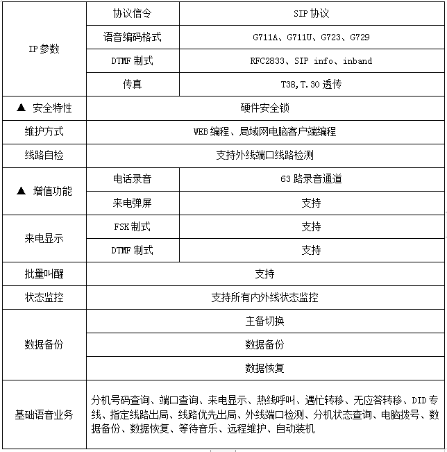 特色功能 ■ 高度兼容性 支持SIP协议,可广泛兼容市面各类型sip协议的IPPBX、软IP、IMS中继,组网方式多种多样,可有效解决传统PBX与IPPBX间的组网连接。 |