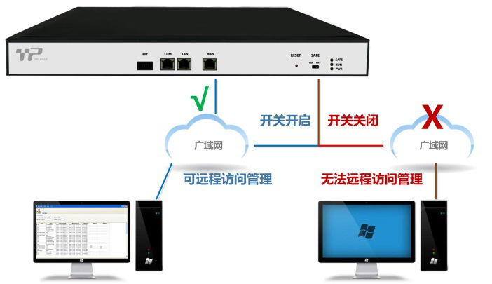 ■ 安全开关 首创硬件安全开关,提升安全级别。设备机身设有独立的网络安全硬开关,当安全开关拨至开启时可对设备进行进行维护调试,当安全开关拨至关闭时,所有内网、外网电脑均无法访问连接,任何的黑客攻击都无法攻破系统,提高系统运行的安全及可靠性。 |