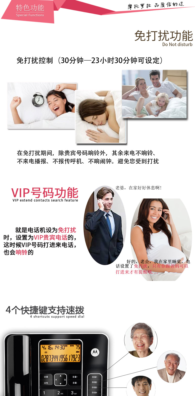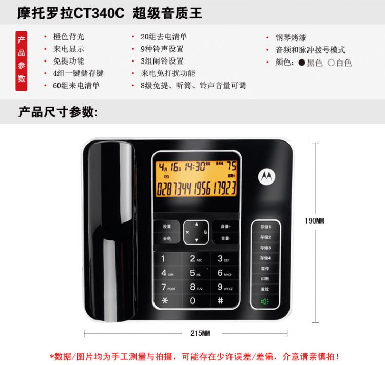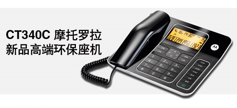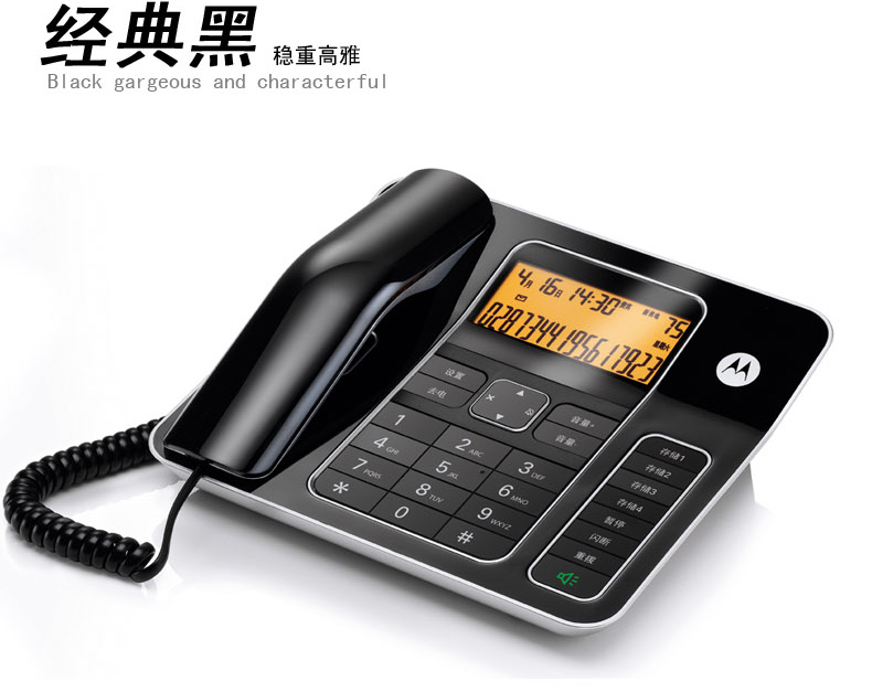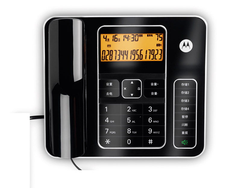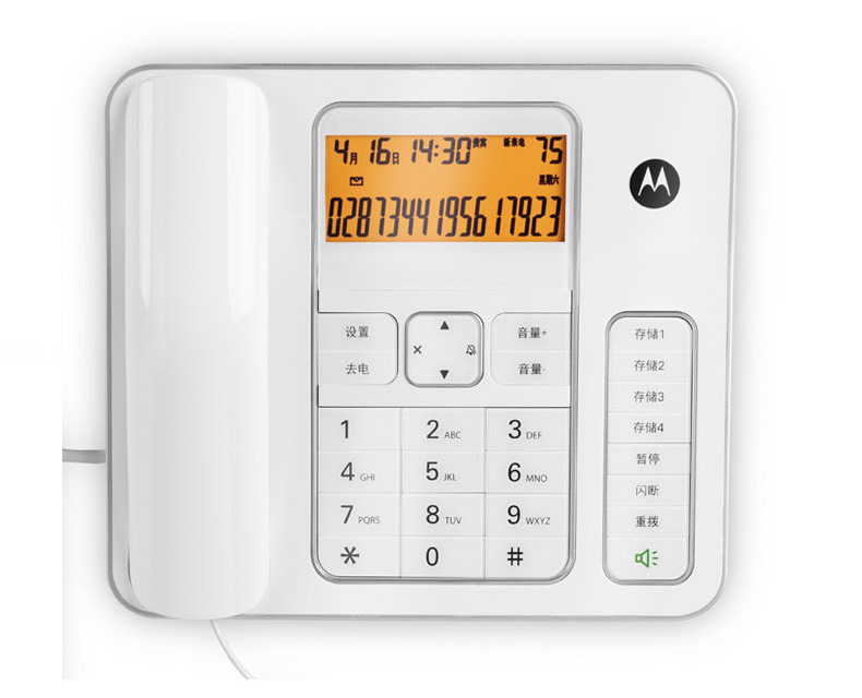 摩托罗拉高档办公来电显示电话支持DTMF/FSK自动检测兼容来电显示双制式70mm*30mm显示屏7段码显示屏、免提通话、免电池构架、具备来去电查询按键功能、话机设置按键、转接、闪断、重拨、保留、音量调节、删除、等功能按键支持2个快捷贮存键、具备提取双记忆按键24首铃声自动IP拨号30组通话列表具备显示时间年月及闹钟等功能。